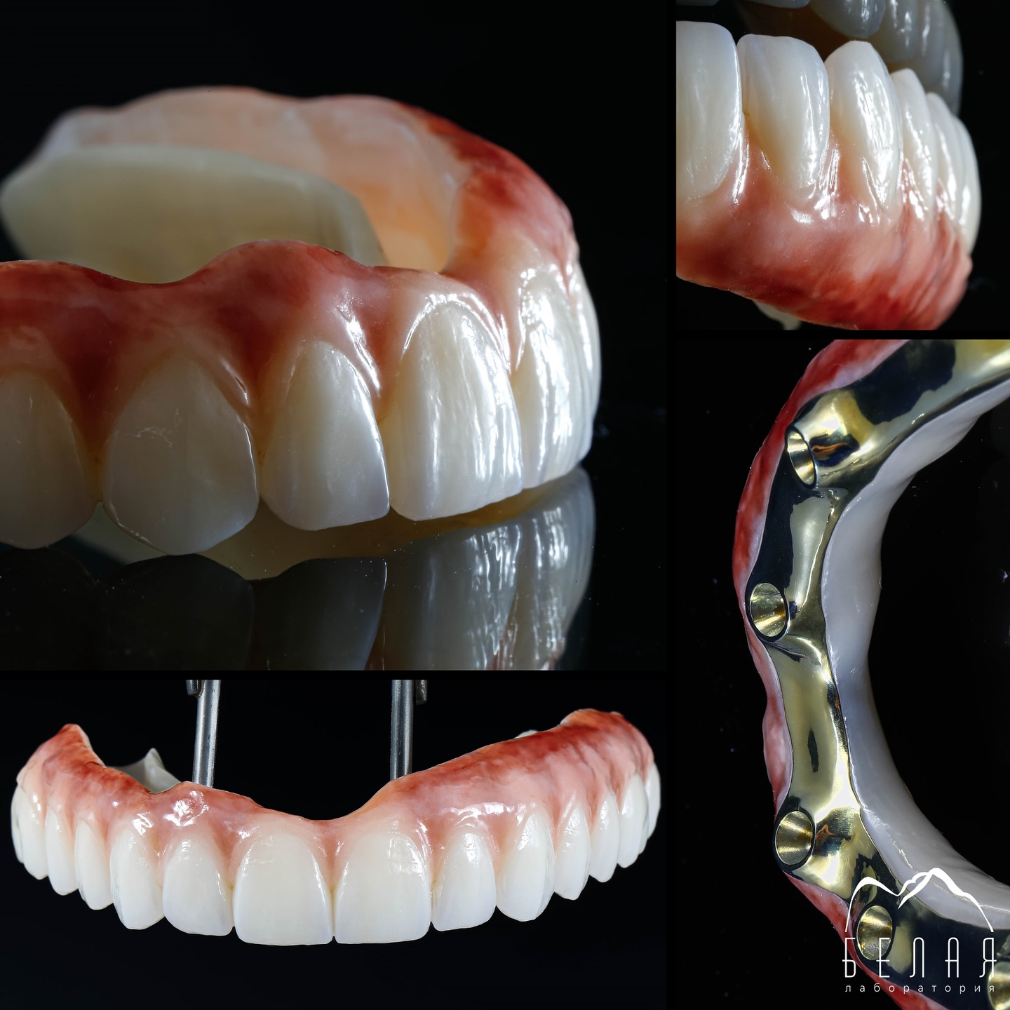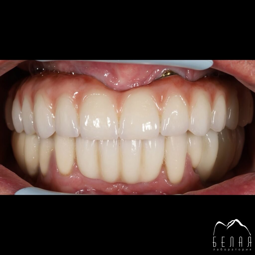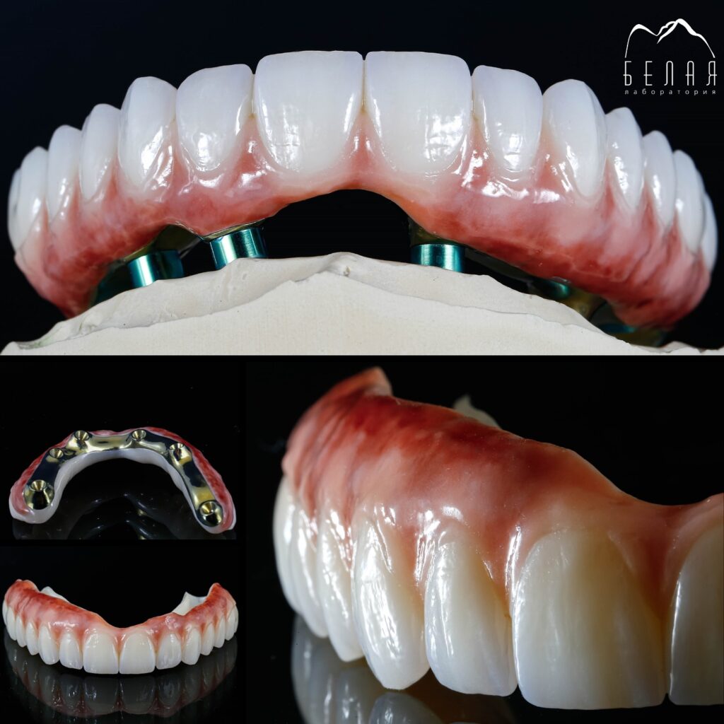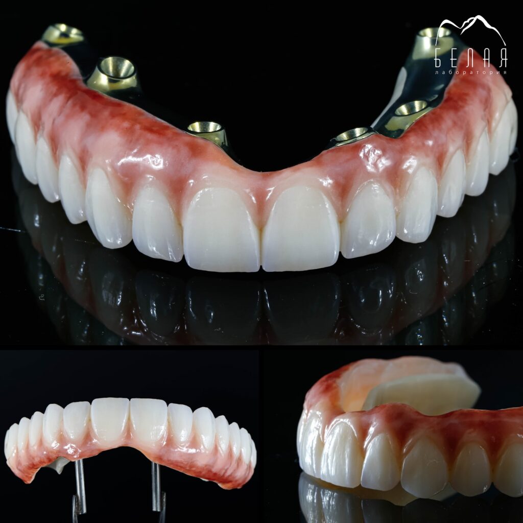Циркон армированный титановой балкой all-on-6 с нанесением керамической десневой массы.