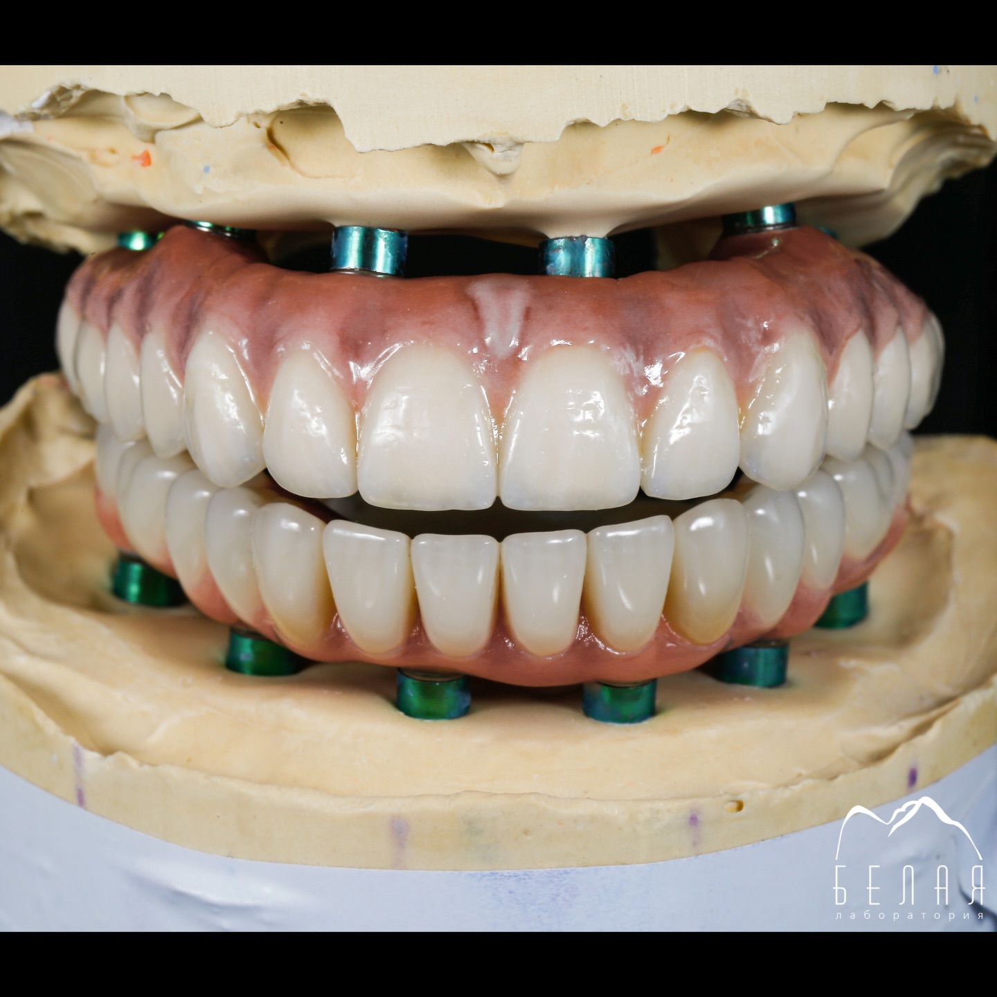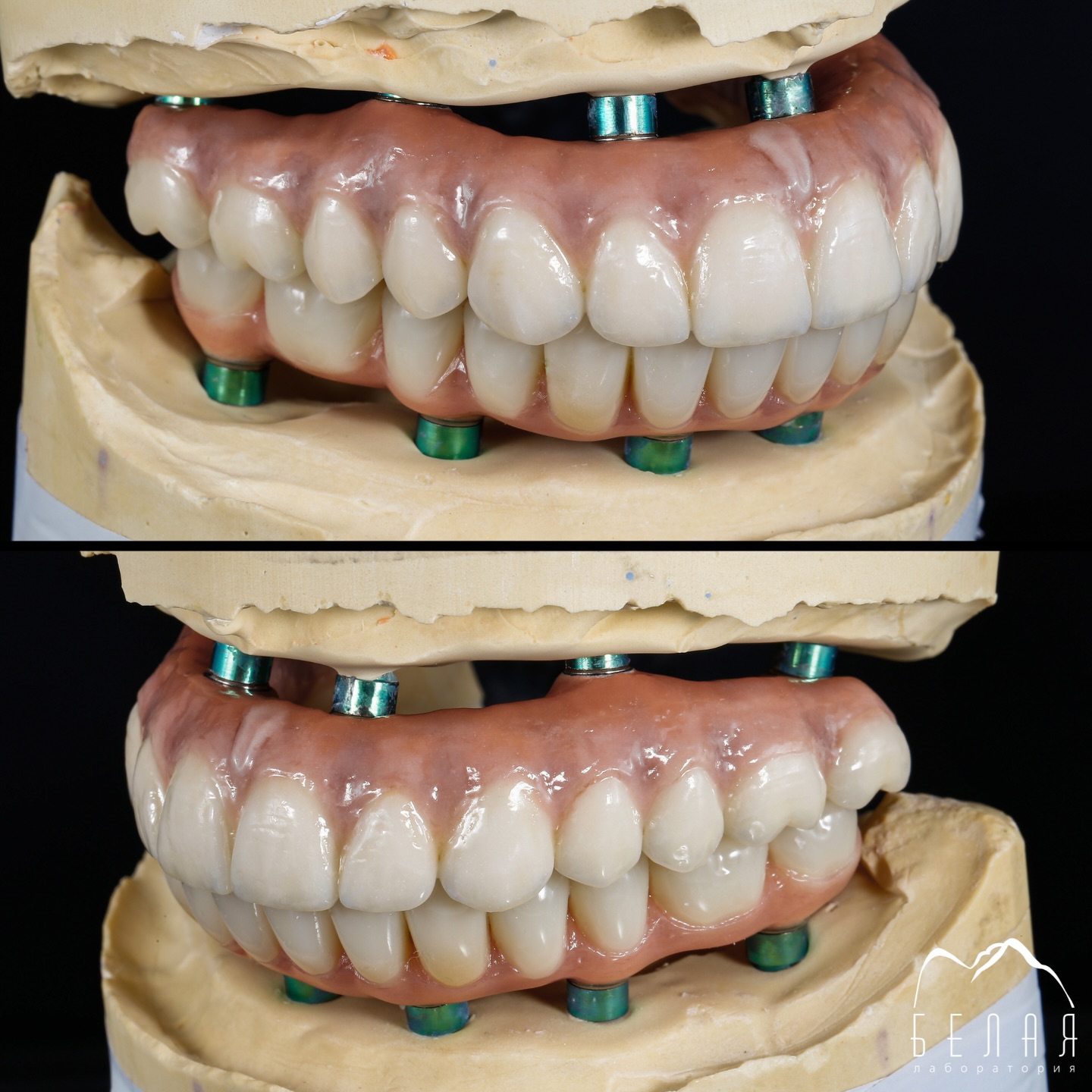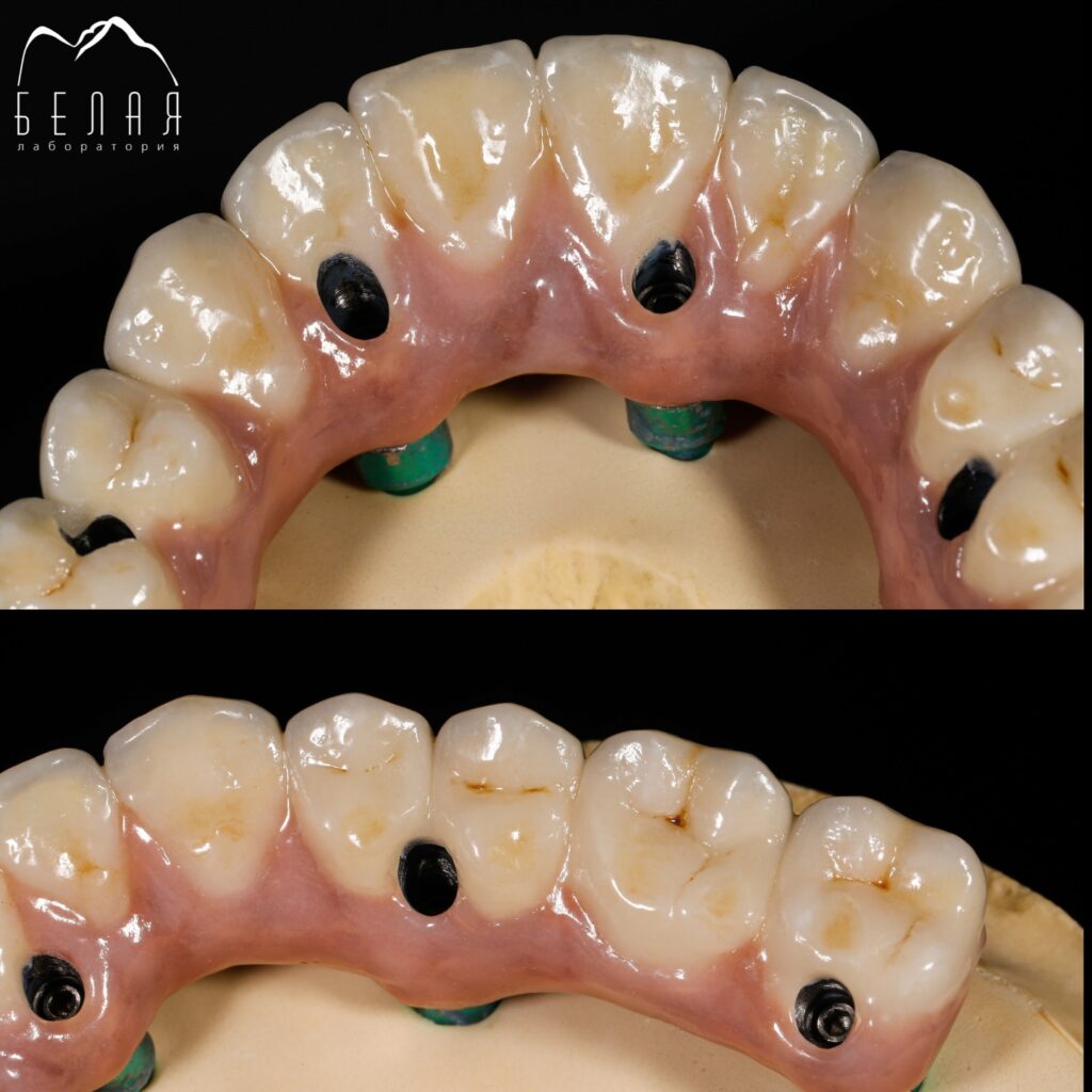 Верхняя челюсть — металлокерамика на имплантах, нижняя челюсть — металлоакрил.